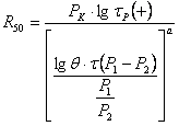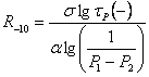где РК - удельное давление от колеса транспортного средства; τР(+) - продолжительность срока службы покрытия при высокой расчетной температуре; θ - время релаксации; τ - время ретардации; а - опытный коэффициент равный 0,15; Р1 и Р2 - показатели, характеризующие кинетику деформации асфальтобетона. Параметры асфальтобетона θ, τ, Р1, Р2, а могут быть установлены по опубликованным данным или по результатам лабораторных испытаний образцов. Во втором случае требуемая прочность асфальтобетонных покрытий при отрицательных температурах (R-10) может быть вычислена по формуле