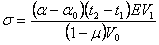 где σ - температурные напряжения (расчетные значения); τР(-) - продолжительность нахождения асфальтобетона в напряженном состоянии, зависящая от скорости охлаждения; при V1 = 10 град./ч. - 360 с, при V2 = 1 град./ч - 360 с; а - эмпирический коэффициент, равный 4. Температурные напряжения σ определяются по формуле