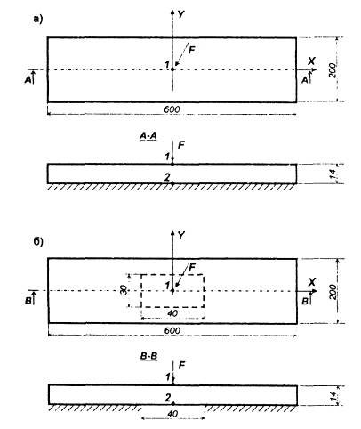 Рассмотрено два варианта: первый (рис. а) - плита имеет полный контакт с основанием; второй (рис. б) - между плитой и основанием существует зазор размером 40×30 см (площадь зазора 1200 см2, т.е. 1 % от общей площади плиты). Расчет произведен методом конечных элементов; размер элемента принят 20×15 см. Результаты расчета для точек 1, 2 (рис.) сведены в табл.