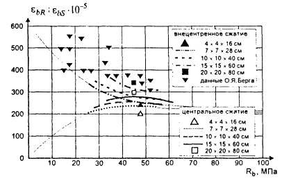 Рис. 2. Изменение предельной деформативности равной прочности и различных размеров Предельные деформации при внецентренном сжатии определялись как средние деформации крайнего волокна бетона сжатой зоны, расклеенных на лицевой стороне образца. С увеличением прочности бетона предельные деформации при центральном и внецентренном сжатии асимптотически приближаются друг к другу. Предельные деформации при внецентренном сжатии зависят от размера образца; большие предельные деформации наблюдаются у образцов большего размера, аналогичная зависимость свойственна образцам при центральном сжатии. С увеличением прочности предельная деформативность уменьшается (рис. 1). Оценка