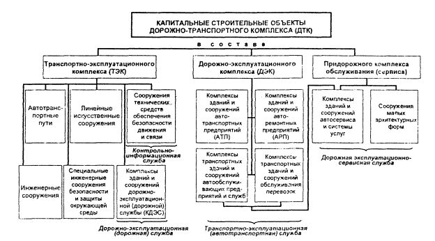 Рис. 2. Основные капитальные строительные объекты в составе дорожно-транспортного комплекса (ДТК) Четвертая группа объединяет линейные строительные объекты предприятий, организаций и служб, предназначенных для осуществления разного рода технологических процессов по текущему содержанию и ремонту автомобильных дорог и размещаемых на них разнообразных искусственных сооружений. В эту группу входят комплексы, здания и сооружения дорожно-ремонтных строительных участков (ДРСУ) и дорожно-ремонтных пунктов (ДРП), а также стационарные поселки работников автотранспортных, автодорожных и других родственных предприятий, организаций и служб. К пятой группе относятся линейные придорожные и целевые строительные объекты разнообразных организационных структур (предприятий, организаций, служб и т.д.), предназначенные для предоставления всем участникам движения жизненно необходимых в пути видов услуг, включая техническое обслуживание, ремонт и хранение их транспортных средств. В эту группу входят комплексы дорожного сервиса (КДС), мотели, кемпинги, ротели и другие. К шестой группе принадлежат специальные линейные строительные объекты в виде инженерных сооружений, предназначенных для обеспечения: безопасности передвижения по городским, внегородским и горным автомобильным дорогам; защиты окружающей среды; шумозащиты селитебных территорий в городах и населенных пунктах от шумовых, загрязняющих и других воздействий автомобильного транспорта, дорожно-информационного обеспечения участников движения - водителей, пассажиров и автотуристов. Такого рода строительными объектами соответственно являются: подземные (ППП) и наземные (НПП) мостового вида пешеходные переходы; подпорные стены и стенки; камне-, лавинозащитные галереи и селезащитные сооружения на горных дорогах; очистные, накопительно-отстойные и другие сооружения; шумоотражающие, шумопоглощающие и комбинированные экраны, сооружения дорожной контрольно-информационной службы, выполненные в виде П- и Г-образных рам, V-образных, стеллообразных и других конструктивных форм, сооружения аварийной телефонной связи и т.д. Наличие на автомобильном транспорте и в составе всего дорожно-транспортного комплекса все более широкой номенклатуры строительных объектов разнообразных организационных структур (предприятий, организаций, служб и т.д.) делает необходимым проведение всестороннего анализа их решений. Осуществление этого необходимо для отбора самых эффективных, рациональных, наилучшим образом зарекомендовавших себя при строительстве и эксплуатации комплексов, зданий и сооружений и использования опыта в последующих разработках новых поколений строительных объектов [7, 8]. Это позволит в сочетании с другими, проводимыми в разных направлениях мероприятиями, полнее реализовать возможности, предоставляемые автомобилизацией и автомобильным транспортом, и в итоге сделать автомобильные сообщения и перевозки более эффективными, надежными, удобными, комфортными и безопасными. ЛИТЕРАТУРА 1. Громов Н.Н., Панченко Т.А., Чудновский А.Д. Единая транспортная система. - М.: Транспорт, 1987. - 304с. 2. Фастовцев Г.Ф. Организация технического обслуживания и ремонта легковых автомобилей. - М.: Транспорт, 1989. - 240 с. 3. Голубев Г.Е. Автомобильные стоянки и гаражи в застройке городов. - М : Стройиздат, 1988. -252