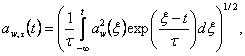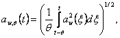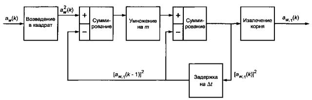где aw - величина, определенная в 3.1.5.1, м/с2; а0 - опорное значение ускорения, равное 10-6 м/с2 (см. [1]). 3.1.5.3 текущее среднеквадратичное значение корректированного ускорения aw,θ(t): Среднеквадратичное значение корректированного ускорения в момент времени t, определяемое формулой где aw(ξ) - текущее значение корректированного ускорения в момент времени ξ; θ - период интегрирования; t - текущее время. Примечание - В качестве аппроксимации линейного усреднения может быть использовано экспоненциальное усреднение, определяемое формулой где τ - постоянная времени экспоненциального усреднения. 3.1.5.4 максимальное кратковременное среднеквадратичное значение (корректированного ускорения) MTVV: Максимальное значение текущего среднеквадратичного значения корректированного ускорения для периода интегрирования θ, равного 1 с. 3.1.5.5 доза укачивания MSDV: Величина, представляющая собой интеграл квадрата корректированного ускорения aw(t), выражаемая в м/с1,5 и определяемая формулой