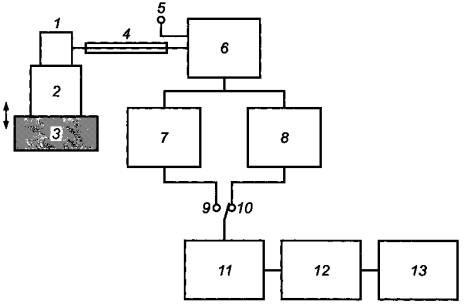 1 - датчик вибрации; 2 - система крепления; 3 - вибрирующая поверхность; 4 - кабель; 5 - электрический вход; 6 - согласование сигнала; 7 - полосовая фильтрация; 8 - частотная коррекция (включая полосовую фильтрацию); 9 - отфильтрованный сигнал; 10 - корректированный сигнал; 11 - временное взвешивание сигнала; 12 - дополнительное преобразование; 13 - показывающее устройство а) Функциональная схема для преобразования сигнала во временной области Рисунок 1 - Функциональная схема средства измерений вибрации, лист 1
