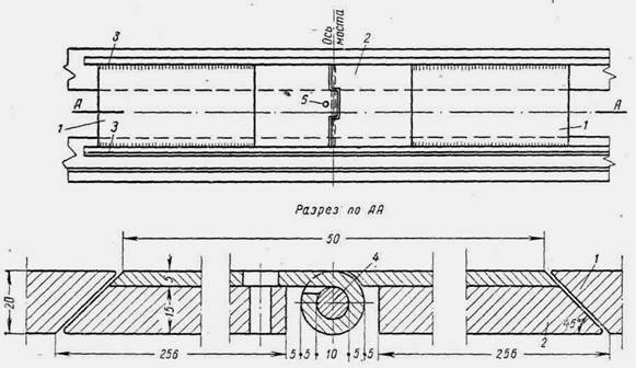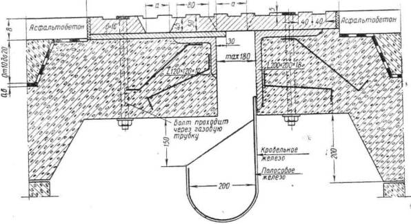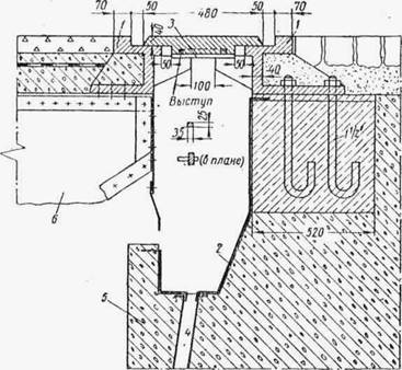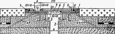 Шов этой конструкции перекрыт скользящей плитой, уложенной на опорные стулья 1. Консоли стульев входят своими выступами в пазы плит. К плитам снизу прикреплены пластинки 3, не позволяющие плитам приподниматься, так как выступы консолей своими боковыми частями заходят в пространство, образованное пластинками и пазами плит. Величина обоих зазоров благодаря принятой конструкции не может быть более 5 см.