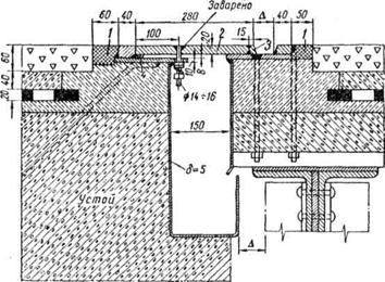 В качестве варианта можно рекомендовать закрепление компенсатора в П-образных формах зачеканкой щелей свинцом или расширяющимся цементом. Закрепление в формах производится заранее в мастерских, после чего формы привариваются к конструкции шва.