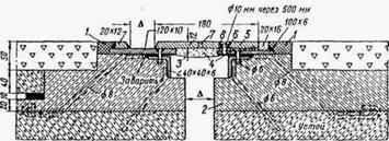 1 - битумная мастика; 2 - слой из цементного раствора; 3 - компенсатор d - 1,5-2,0 мм; 4 - консистентная смазка; 5 - скользящий элемент из съемных и закрепленных плит; 6 - соединительная планка скользящего элемента; 7 - отверстия для нагнетания смазки