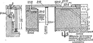 При этом создается наиболее простое закрепление скользящего элемента, при вертикальном смещении в шве. Лоток подвешен с помощью простого соединения в виде крючьев, позволяющих при необходимости снять его. Возможность очистки лотка обеспечена. При затруднительности очистки лотка снизу надо делать съемные плиты и очищать лоток сверху. Предлагаемая конструкция, на наш взгляд, тоже должна найти широкое применение. Целесообразно заводское изготовление ее.