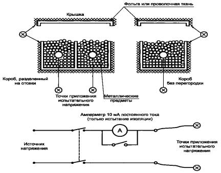проникновения двух отдельных кабелей внутрь образца на Затем внутреннее пространство каждого отсека образца заполняют шаровидными металлическими предметами размером не более После этого комплект образцов подвергают воздействию влаги в испытательной камере, в которой установлена относительная влажность воздуха от 91 % до 95 % при любом подходящем значении температуры t от 20°С до 30°С с точностью ±1°С. Перед помещением в камеру влажности температуру образцов доводят до значения от t до t +4°С, что может быть достигнуто путем выдерживания их при этой температуре не менее 4 ч перед воздействием влаги. В камере влажности образцы выдерживают в течение 48 ч. Относительная влажность воздуха от 91 % до 95 % может быть достигнута путем помещения в камеру влажности емкости с насыщенным водным раствором сульфата натрия (Na2S04) или нитрата калия (KNO3) с большой поверхностью контакта с воздухом. Для обеспечения вышеприведенных условий в камере влажности должна быть постоянная циркуляция воздуха, для чего рекомендуется использовать камеру с термоизоляцией. Сразу же после того как образцы вынут из камеры влажности, их следует обернуть сверху фольгой или тонкой проволочной тканью с хорошей проводимостью. Проводимость металлических предметов внутри образца проверяют путем измерения сопротивления между жилами двух кабелей, введенных в образец. Измеренное сопротивление не должно быть более 100 Ом. Сопротивление изоляции измеряют путем приложения напряжения постоянного тока не менее 500 В между жилами кабелей и фольгой или проволочной тканью. Измерение проводят через 1 мин после приложения напряжения. Сопротивление изоляции должно быть не менее 100 МОм. Затем между кабелями и фольгой или проволочной тканью (как показано на рисунке 3) в течение 1 мин прикладывают напряжение 2500 В неискаженной синусоидальной формы частотой от 50 до 60 Гц от испытательного аппарата, характеристики которого обеспечивают ток 200 мА напряжением 1250 В. Сначала прикладывают не более половины напряжения, а затем его увеличивают до 2500 В с максимальной скоростью, возможной без возникновения переходных перенапряжений. В процессе испытания не должно происходить пробоев изоляции. 13 Внешние воздействияТребования к внешним воздействиям находятся в стадии разработки. Приложение А
