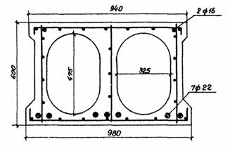 Рис. 1. Конструкция пустотной плиты длиной 1.2. Плиты изготавливают в переносных силовых формах на поточной линии, состоящей из четырех постов, связанных между собой последовательными операциями. 1.3. Пустоты в плитах образуют жесткими металлическими пуансонами, извлекаемыми из свежеуложенного бетона на всю длину в одну сторону изделия. 1.4. Бетонирование плит на поточной линии осуществляется на посту, оснащенном мощными средствами вибрации в позволяющем использовать жесткие бетонные смеси в отличие от стендовой технологий, в которой применяются маломощные средства уплотнения, устанавливаемые на отдельных формах. 1.5. Тепловлажностная обработка предусмотрена без устройства пропарочных камер в штабелях силовых форм с подачей пара в паровые рубашки и пустоты изделий. 2. МАТЕРИАЛЫ ДЛЯ ИЗГОТОВЛЕНИЯ ПЛИТа) Бетон 2.1. Пустотные плиты изготавливают из тяжелого бетона марки "400" с жесткостью смеси не ниже 80 сек (по техническому вискозиметру). Марка бетона по морозостойкости для конструкций мостов в пределах Украины должна быть не ниже Мра 200 (ГОСТ 4795-59). 2.2. В качестве вяжущего в бетонных смесях для плит пролетных строений мостов следует применять портландцемент, пластифицированный, гидрофобный или дорожный портландцемент по ГОСТ 10178-62. Применение шлакопортландцемента, пуццоланового портландцемента и глиноземистого цемента не допускается. Для приготовления бетонной смеси должен применяться цемент марки "500" и выше. Максимально допустимый расход цемента 450 кг/м3. 2.3. В качестве крупного заполнителя для тяжелого бетона рекомендуется