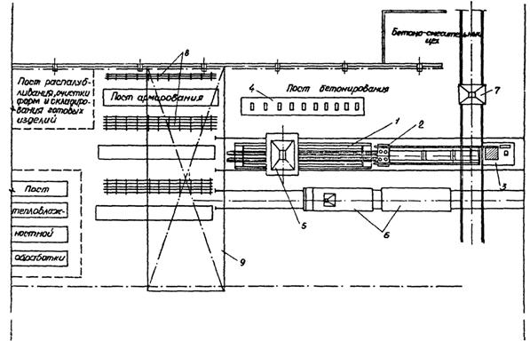 Рис. 2. Схема технологической линии по изготовлению пустотных плит 1 - силовая форма и вибростол; 2 - тележка с пустотообразователями; 3 - лебедка; 4 - вибропригруз; 5 - бетоноукладчик; 6 - тележки для подачи арматурных элементов; 7 - раздаточный бункер; 8 -арматурные сетки; 9 - мостовой кран