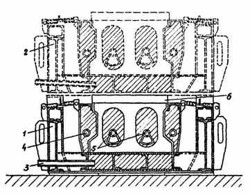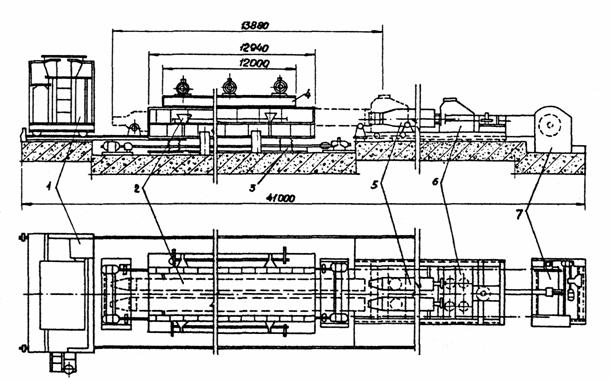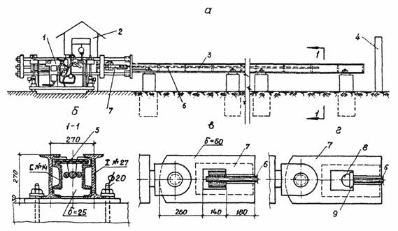 Рис. 3. Пост бетонирования пустотных плит. 1 - бетоноукладчик; 2 - силовая форма; 3 - вибростол; 4- вибропригруз; 5 - пустотообразователи; 6 - тележка; 7 - лебедка. Пустотообразователи вводят и извлекают из формы при помощи устройства, состоящего из подвижной тележки, на которой крепят нерабочие концы пуансонов, системы блоков и лебедки. Бетонирование осуществляют послойно с применением бетоноукладчика типа 6563/IM с ленточным питателем В-2000. Бетон верхней полки уплотняют вибропогрузом весом 4,8 т, обеспечивающим удельное давление на бетон - 40 г/см2. После окончания бетонирования и извлечения пуансонов форму с изделием передают на пост тепловлажностной обработки. 3.4. Пост тепловлажностной обработки оборудован магистральным паропроводом с разводкой, позволяющей подавать пар в рубашки форм и пустоты изделий. Тепловлажностная обработка плит осуществляется в штабелях, при установке одной формы на другую. 3.5. После окончания тепловлажностной обработки изделия с формой подают на пост 4, где раскрывают боковые щиты форм, производят обрезку стержней и передачу напряжения на бетон. Затем плиту извлекают из формы и оставляют на посту до полного остывания, после чего передают на склад готовой продукции. Форму очищают и смазывают механизированно специальными приспособлениями, либо вручную при помощи скребков и кистей. На пост подведен трубопровод подачи смазки форм. Очищенную и смазанную форму передают на пост армирования. 3.6. Посты технологической линии обслуживают два мостовых крана грузоподъемностью 20 и 30 т. Кран грузоподъемностью 30 т предназначен для обслуживания постов армирования, бетонирования и тепловлажностной обработки, грузоподъемностью 20 т - поста распалубливания и склада готовой продукции. 4. ОПАЛУБОЧНЫЕ ФОРМ И ТРЕБОВАНИЯ К НИМ.