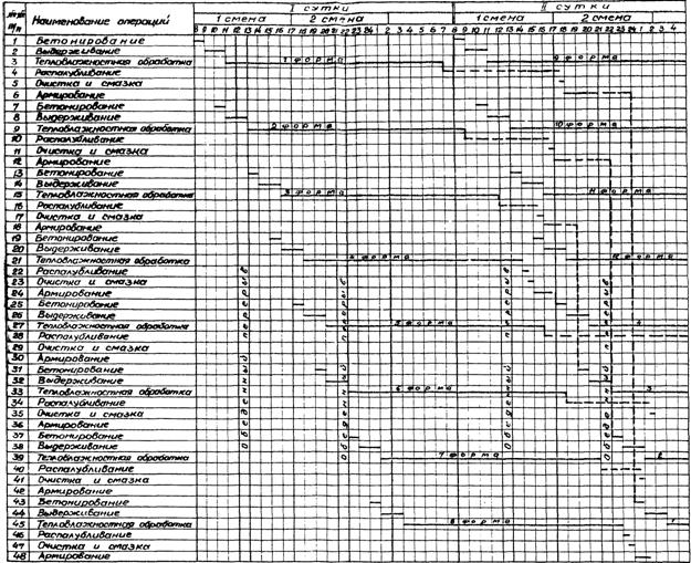 2.7. Ненапрягаемая арматура применяется из стали следующих марок: - гладкие стержни из углеродистой горячекатанной стали класса A-I, марки Ст.3сп. (ГОСТ 5781-61); - стержни периодического профиля из углеродистой горячекатанной стали класса А-II, марки Ст.5сп (ЧМТУ/УНИИМ 10-63). Для монтажных (подъемных) петель следует применять арматуру только класса A-I, марки Ст.3сп. 2.8. Поступающая на предприятия железобетонных конструкций стержневая арматура должна быть связана в пачки, снабженные заводскими бирками. На всю арматуру следует иметь сертификаты заводских испытаний или их копии. Стержневую арматуру необходимо хранить раздельно по классам, диаметрам и партиям. Партия состоит из стержней одной плавки и одного размера. Напрягаемую арматуру необходимо хранить на стеллажах в закрытом сухом помещении, остальную арматуру - на стеллажах под навесом. Для предотвращения коррозии металла не следует допускать многократного переноса арматуры с холода в тепло. 2.9. Каждая партия арматуры должна подвергаться обязательным контрольным испытаниям на растяжение по ГОСТ 12004-66 и загиб в холодном состоянии. Для испытаний отбирают по три образца от трех различных стержней из одной партии. В случае несоответствия результатов какого-либо испытания требованиям ГОСТов и технических условий надлежит производить повторное испытание на двойном количестве образцов, взятых от других стержней этой же партии арматуры. При неудовлетворительных результатах повторного испытания хотя бы по одному образцу вся партия арматуры бракуется. Арматура, пораженная коррозией, перед применением должна быть повторно испытана. Если при этом прочность стержней снизилась более чем на 9 %, то такая арматура не должна использоваться для предварительного напряжения. 3. ТЕХНОЛОГИЧЕСКАЯ СХЕМА ИЗГОТОВЛЕНИЯ ПЛИТ3.1. Поточно-агрегатная линия по изготовлению пустотных плит длиной пост 1 - сборка опалубочных форм, напряжение рабочей арматуры, монтаж ненапрягаемой арматуры; пост 2 - бетонирование плит; пост 3 - тепловлажностная обработка; пост 4 - распалубливание и складирование плит, очистка и смазка форм. 3.2. Пост 1 представляет собой площадку, на которой осуществляется сборка предварительно очищенных и смазанных форм и армирование конструкции. Перед армированием проверяют проектные размеры, поступающих из арматурного цеха на пост стержней и сеток, для чего пост оснащен соответствующими кондукторами. После проверки гидродомкратом ДТС-63-315 с насосной станцией НСП-400 напрягают, стержневую арматуру, производят монтаж ненапрягаемой арматуры и форму передают на пост бетонирования. 3.3. Пост бетонирования (рис. 3) оснащен виброплощадкой, собранной из 16 виброблоков СМЖ-199 общей грузоподъемностью 24 т, на которую устанавливают опалубочную форму. Крепление формы к площадке электромагнитное.