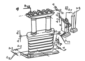Рис. 5. Монтаж сборных опор мостов: а - сборно-монолитная опора; б - опора колонного типа; Δ1, Δ2 - п. 2.2 по табл. 1; Δ3 - Δ5 - п. 2.1; табл. 1; Δ6 - п. 3.8; Δ7 - п. 3.5; Δ8 - п. 6.2; Δ9, Δ10 - п. 6.3; Δ11 - п. 3.7; Δ12 - п. 6.5; Δ13 - п. 7.1