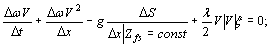 где t - время; х - пространственная координата, направленная по оси потока; V - средняя по сечению скорость; w - площадь поперечного сечения потока; Zfs - уровень свободной поверхности воды; S - статический момент живого сечения потока относительно его свободной поверхности; x - смоченный периметр сечения потока; g - ускорение гравитации; l - коэффициент гидравлического трения: