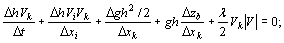 где: t - время; хi - i-я плановая координата (i=1, 2); h - глубина потока; V - вектор средней по глубине скорости потока; Vi - его i-я координата; Zb - уровень дна; k - номер координатной оси, на которую спроецирован импульс. При этом коэффициент гидравлического трения