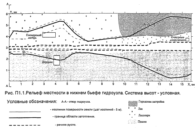"Рис. П1.1. Рельеф местности в нижнем бьефе гидроузла. Система высот - условная"
