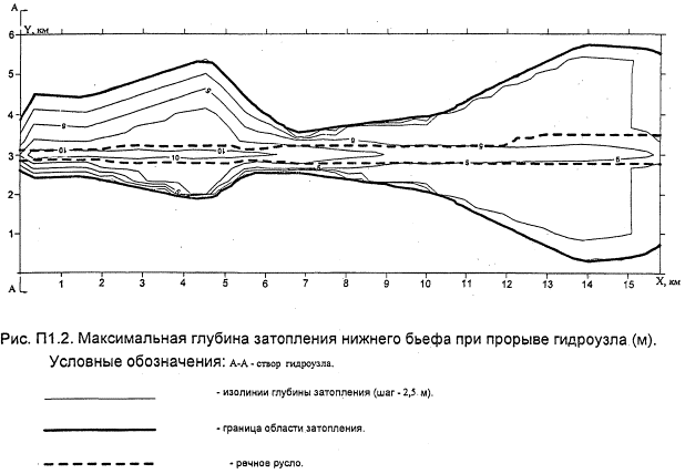 "Рис. П1.2. Максимальная глубина затопления нижнего бьефа при прорыве гидроузла (м)"