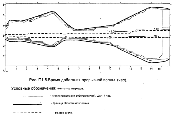 "Рис. П1.5. Время добегания прорывной волны (час)"