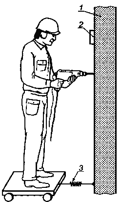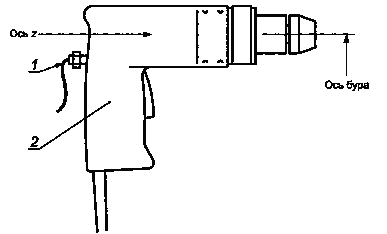 1 - датчик вибрации; 2 - основная рукоятка Рисунок 1 - Пример расположения датчика вибрации и направления измерений Обычно измерения, проводимые в соответствии с настоящим стандартом, требуют применения механических фильтров (см. ГОСТ 16519). Допускается не применять механические фильтры в случае пластиковых рукояток (см. ГОСТ 16519). 5.4. Вспомогательное оборудование Напряжение питания ручных электрических машин измеряют с использованием средств, позволяющих регистрировать среднеквадратичные значения. Давление сжатого воздуха или жидкости в гидравлической системе измеряют высокоточным датчиком давления. Силу нажатия в горизонтальном направлении измеряют с помощью специального устройства (см. 7.3 и рисунок 2). Частоту возвратно-поступательного движения исполнительного механизма определяют посредством электронной фильтрации сигнала с датчика вибрации или с помощью других подходящих средств. 5.5. Калибровка Калибровку выполняют в соответствии с ГОСТ 16519. 6. Точки и направления измеренийИзмерения проводят в направлении оси z (см. рисунок 1), совпадающей с осью бура. 6.2. Точки измерений Измерения проводят на основной рукоятке, за которую оператор удерживает машину при ее нормальной работе и к которой прикладывает силу нажатия. Датчик вибрации устанавливают как показано на рисунке 1, как можно ближе к ладони оператора между большим и указательным пальцами. 7. Условия испытаний7.1. Общие положения Для испытаний используют новую смазанную машину, обеспеченную соответствующим техническим уходом. В процессе испытания ручная машина должна работать при номинальных условиях питания в соответствии с требованиями, определенными изготовителем. Работа ручной машины должна быть стабильной и плавной (см. 7.3). Режим работы машины в процессе испытаний устанавливают в соответствии с характеристиками используемого бура согласно указаниям изготовителя (см. 7.4). В процессе испытаний объект обработки устанавливают таким образом, чтобы оператор мог работать выпрямившись и удерживать машину в горизонтальном положении перпендикулярно к поверхности стены (см. рисунок 2). 1 - бетонная стена; 2 - устройство считывания силы нажатия; 3 - динамометр Рисунок 2 - Рабочая поза оператора 7.2. Нагрузка Во время