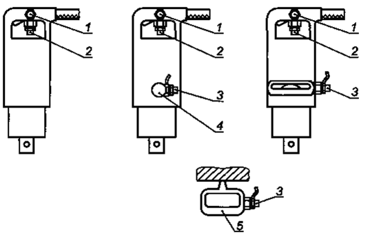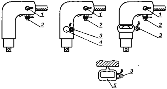 Рисунок 2 - Способы крепления датчика вибрации на рукоятку пистолетного или лучкового типа При установке датчика вибрации следует руководствоваться рекомендациями изготовителя. Дополнительные рекомендации по креплению датчиков вибрации приведены в ГОСТ 31192.2. Выбранный способ крепления датчика вибрации указывают в протоколе испытаний. 5.5.Вспомогательное оборудование Давление подачи воздуха или жидкости в систему питания измеряют прецизионными манометрами (см., например, [1]). Силу нажатия измеряют устройством, обеспечивающим неопределенность измерений не более ± 1 Н. Частоту ударов хвостовика измеряют с помощью электронных фильтров, используя для этого сигнал датчика вибрации, или другими подходящими способами. 5.6. Калибровка Калибровку выполняют в соответствии с ГОСТ 16519. 6. Точки и направления измеренийИзмерения вибрации проводят в точках и направлениях, показанных на рисунке 3, в зависимости от типа ручной машины. Обычно датчик вибрации устанавливают в точке посередине рукоятки. Если такому размещению датчика вибрации мешает положение пускового устройства, то его устанавливают по возможности ближе к указанной точке. Для ручной машины с рукояткой прямого типа датчик вибрации устанавливают на расстоянии (6 ± 1) мм от поверхности рукоятки так, чтобы направление измерений было параллельно оси вала двигателя, как показано на рисунках 1 и 3а). 7. Условия испытанийДля испытаний используют новую, смазанную ручную машину, обеспеченную соответствующим техническим уходом. Ручные машины с гидравлическим приводом до начала проведения измерений прогревают в течение 10 мин. Пневматические машины прогрева не требуют. Время прогрева зажимных устройств при работе ручной машины на устройстве нагружения, описанном в 7.2 - 20 с. 1 - датчик вибрации a) Ручная машина с рукояткой прямого типа, параллельной оси двигателя (выходной вал может быть параллелен валу двигателя или находиться под углом к нему) 1 - датчик 1; 2 - датчик 2; 3 - датчик 3; 4 - поддерживающая рукоятка прямого типа; 5 - поддерживающая рукоятка лучкового типа b) Ручная машина с рукояткой пистолетного типа (поддерживающая рукоятка может присутствовать или отсутствовать; выходной вал может быть параллелен валу двигателя или находиться под углом к нему) Рисунок 3 - Направления измерений и примеры размещения датчика вибрации, лист 1 1 - датчик 1; 2 - датчик 2; 3 - датчик 3; 4 - поддерживающая рукоятка прямого типа; 5 - поддерживающая рукоятка лучкового типа с) Ручная машина с рукояткой лучкового типа (поддерживающая рукоятка может присутствовать или отсутствовать; выходной вал может быть параллелен валу двигателя или находиться под углом к нему) Рисунок 3 - Направления измерений и примеры размещения датчика вибрации, лист 2 В