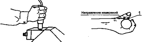 1 - датчик (расположен за большим пальцем кисти руки) b) Прямая ручная машина с прямой рукояткой [см. рисунок 3а), слева] (рука оператора расположена горизонтально и перпендикулярно к рукоятке; измерительная ось датчика вибрации параллельна предплечью оператора)