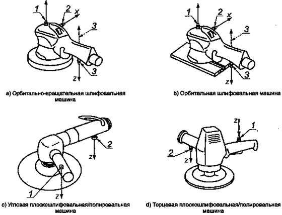 Рисунок 1 - Способы крепления датчика вибрации При установке датчика вибрации следует руководствоваться рекомендациями изготовителя. Датчик небольших размеров допускается прикреплять клеевой мастикой. Если рукоятка ручной машины имеет мягкое упругое покрытие, используют хомут с установленным на нем датчиком для наиболее плотного прижатия покрытия. Допускается использовать также специальный адаптер - см. ГОСТ 16519. Дополнительные рекомендации по креплению датчиков вибрации приведены в ГОСТ 31192.2. Выбранный способ крепления датчика вибрации указывают в протоколе испытаний. Ось чувствительности датчика вибрации должна быть перпендикулярна к поверхности, на которую тот установлен, и совпадать с направлением оси измерений по 6.1 в пределах ± 15°. Если отклонение превышает ± 15°, то следует использовать установочный блок. 5.5. Вспомогательное оборудование Давление подачи воздуха измеряют прецизионными манометрами (см. [1]). Силу нажатия в вертикальном направлении измеряют устройством, обеспечивающим неопределенность измерений не более ± 1 Н. 5.6. Калибровка Калибровку выполняют в соответствии с ГОСТ 16519. 6. Точки и направления измерений6.1. Направление измерений В точках измерения на корпусе (ложементе) ручной машины измерения проводят в направлениях, указанных на рисунке 2. Для ручных машин с рукоятками измерения проводят на этих рукоятках в направлении оси вращения исполнительного устройства (см. рисунок 2).