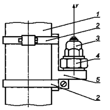 1 - зона обхвата; 2 - хомут; 3 - датчик вибрации; 4 - механический фильтр; 5 - жесткая площадка Рисунок 1 - Способы крепления датчика вибрации и направление измерений 5.5. Калибровка Калибровку выполняют в соответствии с ГОСТ 16519. 5.6. Вспомогательное оборудование Давление сжатого воздуха или жидкости в гидравлической системе измеряют высокоточным датчиком давления. Частоту ударов хвостовика в процессе измерений определяют с помощью узкополосного анализа сигнала вибрации или частотомера. Для измерения силы нажатия используют весы (см. 7.3). 6. Точки и направления измерений6.1. Направления измерений Измерения проводят в направлении нанесения ударов (ось y на рисунке 2). 6.2. Точки измерений Измерения проводят во всех зонах обхвата, которые оператор обычно использует для удержания машины и приложения силы нажатия. Если во всех этих зонах вибрация приблизительно одинакова, допускается проведение измерений только в одной основной зоне. Нормальное положение датчика вибрации - посередине длины зоны обхвата (см. рисунок 2), за исключением случаев, когда этому мешает расположение пускового устройства.