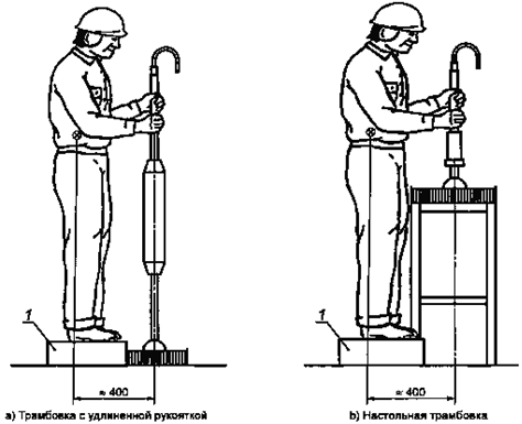 1 -весы Рисунок 3 - Рабочая поза оператора 7.2. Поглотитель энергии ударов Поглотитель энергии состоит из стального ящика с толстыми трехмиллиметровыми стенками размером 500×500 мм, заполненного ударопоглощающим вспененным неопреновым материалом жесткостью от 40 до 50 единиц по шкале Шора и толщиной Примечание - Установлено, что такой ящик дает поглощение и отражение ударной волны, аналогичное тому, которое имеет место при использовании трамбовок во время выполнения реальных рабочих операций. Сила нажатия, приложенная к машине, в совокупности с весом самой машины должна обеспечить ее нормальное функционирование, т.е. стабильный и ровный режим работы.