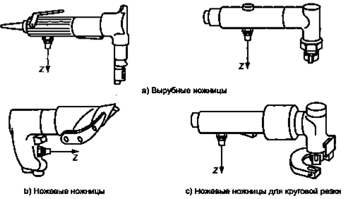 Рисунок 1 - Способы крепления датчика вибрации 5.5. Вспомогательное оборудование Давление подачи воздуха или жидкости измеряют с прецизионными манометрами (см., например [1]). Частоту возвратно-поступательного движения исполнительного механизма определяют в результате электронной фильтрации сигнала датчика вибрации или другими подходящими средствами. 5.6. Калибровка Калибровку выполняют в соответствии с ГОСТ 16519. 6. Точки и направления измерений6.1. Направление измерений Измерения проводят в направлении возвратно-поступательного движения z (см. рисунок 2). 6.2. Точки измерений Измерения проводят на основной рукоятке, за которую оператор удерживает машину при ее нормальной работе и к которой прикладывает усилие нажатия. Датчик вибрации обычно устанавливают внизу рукоятки посередине ее длины. Если такому размещению датчика мешает пусковое устройство, то датчик устанавливают как можно ближе к кисти оператора между его указательным и средним пальцами (см. рисунок 2).