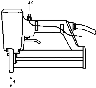 1 - Направление нанесения ударов Рисунок 2 - Точка и направление измерений 6.2. Точки измерений Измерения проводят на рукоятке, где находится устройство пуска и за которую оператор удерживает ручную машину при ее нормальной работе. Датчик вибрации устанавливают как можно ближе к зоне обхвата рукоятки рукой оператора параллельно оси нанесения ударов (см. рисунок 2). 7. Условия испытаний7.1. Общие положения Для испытаний используют новую смазанную машину, обеспеченную соответствующим техническим уходом. Ручную