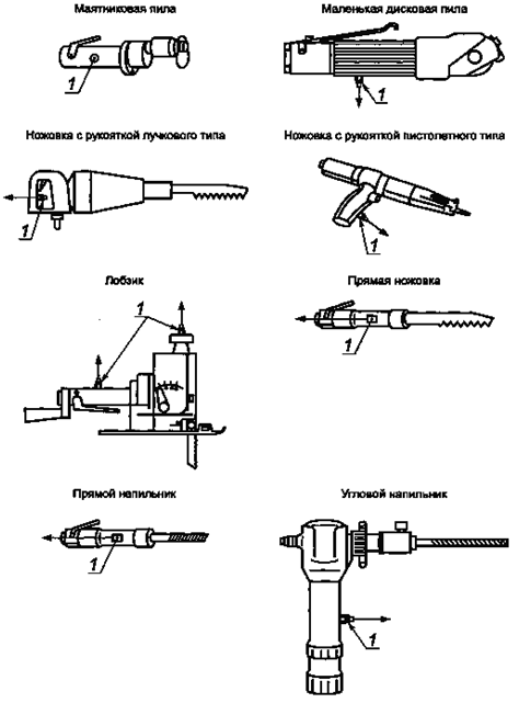 1 -датчик вибрации (на корпус прямой машины для измерений вибрации в направлении возвратно-поступательного движения вставного инструмента датчик устанавливают через переходный блок) Рисунок 2 - Направления измерений и примеры размещения датчиков вибрации 6.2. Точки измерений Измерения проводят на основной рукоятке, за которую оператор удерживает ручную машину при ее нормальной работе и к которой прикладывает усилие нажатия. Датчик вибрации устанавливают на рукоятке посередине длины зоны обхвата или на корпусе (см. рисунок 2). Если такому размещению датчика мешает пусковое устройство, то датчик устанавливают как можно ближе к кисти оператора между его большим и указательным пальцами. Если ручная машина снабжена вспомогательной рукояткой, на ней также устанавливают датчик вибрации. 7. Условия испытаний7.1. Общие положения Для испытаний используют новую смазанную машину, обеспеченную соответствующим техническим уходом. В процессе испытаний ручную машину удерживают способом, характерным для операций распиливания или опиливания. В