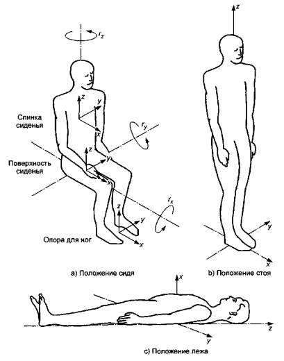 Рисунок 1 - Базицентрическая система координат для тела человека 5 Измерение вибрации5.1 Общие положения Основной измеряемой величиной является виброускорение (см. раздел 4). В области очень низких частот и низких уровней вибрации, что можно наблюдать, например, внутри зданий или на морских судах, измеряемой величиной может быть виброскорость, которая затем должна быть преобразована в виброускорение. 5.2.1 Вибрацию измеряют в направлении осей системы координат с центром в точке контакта тела человека с вибрирующей поверхностью. Основные базицентрические системы координат показаны на рисунке 1. 5.2.2 Если точно совместить ось чувствительности датчика вибрации (далее - датчик) с осью базицентрической системы координат невозможно, допускается расхождение между ними в пределах 15°. Для наклонного сиденья оси системы координат следует связать с телом человека; при этом направление оси z не обязательно будет вертикальным. Направление осей базицентрической системы координат относительно поля силы тяжести должно быть зафиксировано. 5.2.3 При одновременном измерении вибрации в одной точке, но разных направлениях датчики должны быть расположены как можно ближе друг к другу. 5.3.1 Датчик должен быть размещен в точке, где вибрация передается на тело человека. Рекомендуются следующие точки измерений: - подушка сиденья - точка под седалищным бугром сидящего человека; - спинка сиденья - точка, в которой давление тела человека максимально; - опорная поверхность для ног - точка наиболее частого контакта ноги с поверхностью. Для лежащего человека измерения проводят на опорной поверхности под тазом, спиной и головой. Во всех случаях точки измерений должны быть точно зафиксированы. Примечания 1 Если проведение непосредственных измерений вибрации на поверхности контакта тела человека и опорной поверхности невозможно из практических соображений, ее допускается измерять на жестких элементах конструкции здания или транспортного средства. Использование таких данных в целях оценки воздействия вибрации на человека требует проведения дополнительных расчетов и знания динамики поведения конструкции. 2 Если измерения на спинке сиденья в точке ее контакта с телом человека невозможны, допускается их проведение на раме за спинкой. В этом случае результаты измерений должны быть корректированы с учетом передаточных свойств спинки сиденья. 3 Вибрация, передаваемая на тело человека от жестких поверхностей, может быть измерена на опорной поверхности вблизи области контакта (обычно в пределах 10 см от центра этой области). 5.3.2 Вибрация, передаваемая телу человека через мягкие или упругие материалы (например, подушку сиденья или дивана), должна быть измерена с помощью датчика, установленного между телом человека и основной областью контакта на поверхности. Для этого датчик помещают внутрь специального установочного приспособления. Последнее не должно сильно изменять распределение давления на поверхность упругого материала. При измерениях на мягкой поверхности человек должен принять нормальное для данных условий положение. Примечание - Типичная конструкция приспособления для крепления акселерометра при проведении измерений на сиденье представлена в ГОСТ ИСО 10326-1-2002. 5.4 Общие требования к средствам измерения Средства измерения должны соответствоват