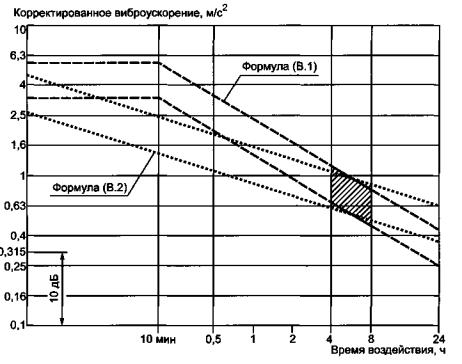 На рисунке В.1 штриховой линией указаны границы зоны предупреждения при оценке влияния вибрации на здоровье человека для первого способа.