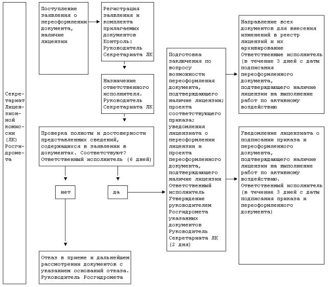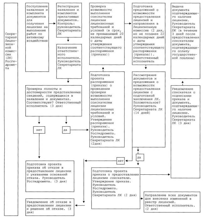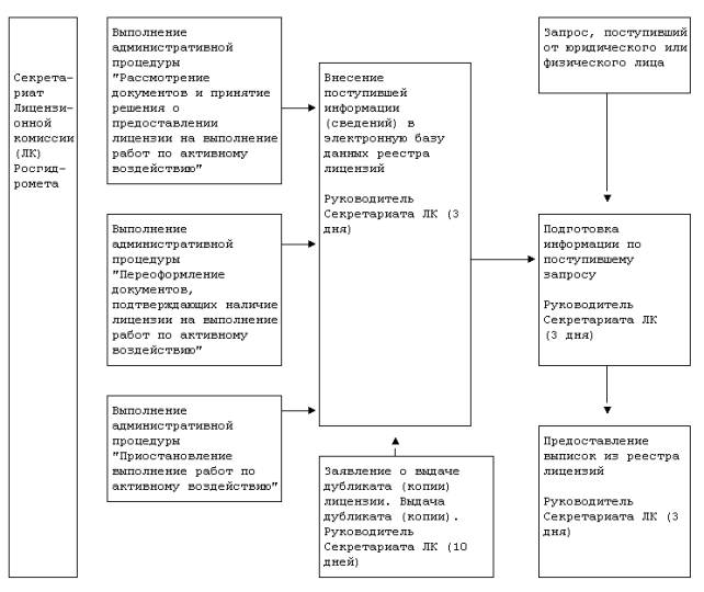 1. Общие положения1.1. Административный регламент Федеральной службы по гидрометеорологии и мониторингу окружающей среды (Росгидромет) по исполнению государственной функции по лицензированию выполнения работ по активному воздействию на гидрометеорологические процессы и явления (далее - Регламент) разработан на основе: Федерального закона от 30.12.2001 N 195-ФЗ "Кодекс Российской Федерации об административных правонарушениях" (Собрание законодательства Российской Федерации, 07.01.2002, N 1 (ч. I), ст. 1), (в ред. Федеральных законов от 25.04.2002 N 41-ФЗ, от 25.07 2002 N 112-ФЗ, от 30.10.2002 N 130-ФЗ, от 31.10.2002 N 133-ФЗ, от 31.12.2002 N 187-ФЗ, от 30.06.2003 N 86-ФЗ, от 04.07.2003 N 94-ФЗ, от 04.07.2003 N 103-ФЗ, от 11.11.2003 N 138-ФЗ, от 11.11.2003 N 144-ФЗ, от 08.12.2003 N 161-ФЗ, от 08.12.2003 N 169-ФЗ, от 23.12.2003 N 185-ФЗ, от 09.05 2004 N 37-ФЗ, от 26.07.2004 N 77-ФЗ, от 28.07.2004 N 93-ФЗ, от 20.08.2004 N 114-ФЗ, от 20.08.2004 N 118-ФЗ, от 25.10.2004 N 126-ФЗ, от 28.12.2004 N 183-ФЗ, от 28.12.2004 N 187-ФЗ, от 30.12.2004 N 211-ФЗ, от 30.12.2004 N 214-ФЗ, от 30.12.2004 N 219-ФЗ (ред. 21.03.2005), от 07.03.2005 N 14-ФЗ, от 07.03.2005 N 15-ФЗ, от 21.03.2005 N 19-ФЗ, от 21.03.2005 N 21-ФЗ, от 22.04.2005 N 38-ФЗ, от 09.05.2005 N 45-ФЗ, от 18.06.2005 N 66-ФЗ, от 02.07.2005 N 80-ФЗ, от 02.07.2005 N 82-ФЗ, от 21.07.2005 N 93-ФЗ, от 21.07.2005 N 113-ФЗ, от 22.07.2005 N 120-ФЗ, от 27.09.2005 N 124-ФЗ, от 05.12.2005 N 156-ФЗ, от 19.12.2005 N 161-ФЗ, от 26.12.2005 N 183-ФЗ, от 27.12.2005 N 193-ФЗ, от 31.12.2005 N 199-ФЗ, от 05.01.2006 N 7-ФЗ, от 05.01.2006 N 10-ФЗ, от 02.02.2006 N 19-ФЗ, от 03.03.2006 N 30-ФЗ, от 16.03.2006 N 41-ФЗ, от 15.04.2006 N 47-ФЗ, от 29.04.2006 N 57-ФЗ, от 08.05.2006 N 65-ФЗ, от 03.06.2006 N 73-ФЗ, от 03.06.2006 N 78-ФЗ, от 03.07.2006 N 97-ФЗ, от 18.07.2006 N 111-ФЗ, от 18.07.2006 N 121-ФЗ, от 26.07.2006 N 133-ФЗ, от 26.07.2006 N 134-ФЗ, от 27.07.2006 N 139-ФЗ, от 27.07.2006 N 153-ФЗ, от 16.10.2006 N 160-ФЗ, от 03.11.2006 N 181-ФЗ, от 03.11.2006 N 182-ФЗ, от 05.11.2006 N 189-ФЗ, от 04.12.2006 N 201-ФЗ, от 04.12.2006 N 203-ФЗ, от 18.12.2006 N 232-ФЗ, от 29.12.2006 N 258-ФЗ, от 29.12.2006 N 262-ФЗ, от 30.12.2006 N 266-ФЗ, от 30.12.2006 N 270-ФЗ, от 09.02.2007 N 19-ФЗ, от 29.03.2007 N 39-ФЗ, от 09.04.2007 N 44-ФЗ, от 09.04.2007 N 45-ФЗ, от 20.04.2007 N 54-ФЗ, от 07.05.2007 N 66-ФЗ, от 10.05.2007 N 70-ФЗ, от 22.06.2007 N 116-ФЗ, от 19.07.2007 N 141-ФЗ, от 24.07.2007 N 204-ФЗ, от 24.07.2007 N 210-ФЗ, от 24.07.2007 N 211-ФЗ, от 24.07.2007 N 218-ФЗ, от 02.10.2007 N 225-ФЗ, от 18.10.2007 N 230-ФЗ, от 08.11.2007 N 257-ФЗ, от 27.11.2007 N 273-ФЗ, от 01.12.2007 N 304-ФЗ, от 06.12.2007 N 333-ФЗ, с изм., внесенными Федеральным законом от 24.07.2007 N 212-ФЗ) (Собрание законодательства РФ, 08.10.2007, N 41, ст. 4845); Федерального закона от 08.08.2001 N 128-ФЗ "О лицензировании отдельных видов деятельности" (Собрание законодательства Российской Федерации, 13.08.2001, N 33 (часть I), ст. 3430); Федерального закона от 08.08.2001 N 134-ФЗ "О защите прав юридических лиц и индивидуальных предпринимателей при проведении государственного контроля (надзора)" (Собрание законодательства Российской Федерации, 13.08.2001 N 33 (часть 1), ст. 3436); Федерального закона от 19.07.1998 N 113-ФЗ "О гидрометеорологической службе" (Собрание законодательства Российской Федерации, 1998, N 30, ст. 3609); Налогового кодекса Российской Федерации (Собрание законодательства Российской Федерации, N 31, 03.08.1998, ст. 3824; N 32, 07.08.2000, ст. 3340); в соответствии: с Постановлением Правительства Российской Федерации от 13.08.2006 г. N 497 "О лицензировании деятельности в области гидрометеорологии и смежных с ней областях, а также работ по активному воздействию на гидрометеорологические и геофизические процессы и явления" (Собрание законодательства Российской Федерации, 21.08.2006, N 34, ст. 3685); с Постановлением Правительства Российской Федерации от 11.04.2006 N 208 "Об утверждении формы документа, подтверждающего наличие лицензии" (Собрание законодательства Российской Федерации, 17.04.2006, N 16, ст. 1746); с Постановлением Правительства Российской Федерации от 26.01.2006 N 45 "Об организации лицензирования отдельных ви