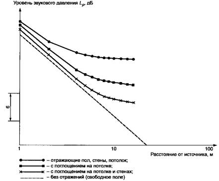 a) Если плотность источников шума в помещении высока, рабочие места расположены вблизи от источников шума, обработка поверхностей может быть полезной, если собственное звуковое поле в непосредственной близости от источника является преобладающим над звуком, приходящим от других источников или отраженным от ограждений помещения.