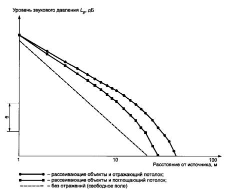 Примечание - Высота помещения намного меньше двух других его измерений. Рисунок 9 - Типичные графики пространственного распределения звука в помещении с размещенным оборудованием при отсутствии диффузного поля и с потолком без звукопоглощающего материала 6.4 Распространение звука по структурам и средства защиты от структурного шума Передачу воздушного шума в смежные помещения или в щели снижают увеличением звукоизоляции стен, потолков, окон и дверей (см. приложение Н). Возникновение структурного шума следует предотвращать заранее, поскольку его весьма трудно вывести затем из структуры. Меры по ослаблению передачи воздушного и структурного шума (см. приложения G и Н) следует рассматривать на этапе проектирования, в противном случае их невозможно будет реализовать. 7 Защита от шума на рабочем местеСредства снижения шума в источнике и по пути его распространения могут быть дополнены затем средствами защиты от шума на рабочем месте, например экранами и кабинами (см. приложения Е и I). 8 Методы контроля8.1 Общие положения Источники звука, средства защиты от шума, распространение звука, уровень звука на рабочих местах и звукоизоляция зданий описываются акустическими величинами. Эти акустические величины и значения снижения уровней звука на рабочем месте с помощью специальных средств часто устанавливают и согласуют в планах, программах и контрактах. Значения этих акустических величин и эффективность мер защиты от шума должны быть подвергнуты контролю на месте установки. При сравнении значений этих величин с заданными (целевыми) значениями следует учитывать неопределенность измерений. 8.2 Источники звука Заявленные значения шумовых характеристик могут быть проверены методами, установленными в ГОСТ 30691. Шумовые характеристики следует контролировать в соответствии с требованиями специальных стандартов на испытания машин на шум или основополагающих стандартов на методы измерения шума (см. ГОСТ 31252, ГОСТ 30457 и ГОСТ 31171). При контроле заявленных значений важно, чтобы режим работы и условия монтажа были такими же, как указаны в заявлении шумовых характеристик или в технических документах на машину. Средства защиты от шума оценивают по снижению уровня иммиссии (звукового давления на рабочем месте). 8.3 Устройства защиты от шума Эффективность устройств защиты от шума можно измерить и проверить по значениям вносимых потерь, потерь при передаче или снижения уровней звукового давления (см. приложения С, D, Е и I). Покупатель и продавец должны договориться об используемых для контроля параметрах. 8.4 Рабочие (производственные) помещения Акустическое качество производственных и офисных помещений можно оценить, применяя следующие параметры распространения звука: пространственный спад DL2 и эксцесс DLf уровня звукового давления и время реверберации. Эти три величины могут быть измерены или вычислены (см. ГОСТ Р 52797.3). Значения, согласуемые сторонами на стадии планирования, обычно устанавливают вычислениями. Контролируемые величины измеряют. Метод контроля: должен быть применен ненаправленный источник звука с известной звуковой мощностью. Источник располагают низко над полом, все точки измерений - на той же высоте. Если источник звука поворачивать и в каждой точке измерений определять усредненный по направлениям источника уровень звук