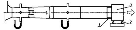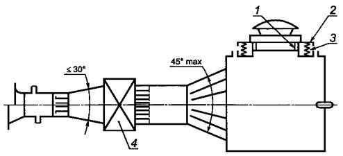 постоянный прогиб в пределах Примечания 1 Устройство опоры вентилятора может существенно повлиять на производимую им вибрацию. В общем случае все опоры можно разделить на две группы: упругие и жесткие. Чтобы минимизировать влияние опоры на измеряемую вибрацию и тем самым обеспечить сопоставимость результатов разных испытаний, рекомендуется использовать упругие опоры (мягкий подвес). Если жесткость опоры такова, что частота собственных колебаний опоры fn близка к частоте, соответствующей рабочей скорости вентилятора, это может привести к появлению колебаний высокой амплитуды. Поэтому для измерений в соответствии с настоящим стандартом предполагают, что собственная частота колебаний жесткой опоры fn более чем в 1,5 раза превышает частоту вращения ротора вентилятора, а собственная частота колебаний упругой опоры fn составляет менее чем 0,25 частоты вращения ротора вентилятора. 2 Испытания с использованием резиновых жгутов в качестве подвеса рекомендуется проводить в процессе конструирования и изготовления вентиляторов, в том числе для определения его BV-категории (см. ГОСТ 31350). Конструкция испытательной установки зависит от вида и места проведения испытаний. Испытания при конструировании и изготовлении вентилятора допускают использование более сложных установок. Однако в любом случае должна быть предусмотрена возможность контролировать аэродинамическую нагрузку, которая влияет на производимую вентилятором вибрацию. Для этих целей рекомендуется использовать стандартные воздуховоды по ГОСТ 10921 или [1]. Примечание - Две типичные установки для испытаний вентилятора на вибрацию показаны на рисунках 1 и 2. 1 - гибкая вставка; 2 - упругая опора; 3 - вентилятор а Угол расширения переходного конуса. Примечание - На данном рисунке [см. [1], рисунок 74 а)] изображена установка, которая может быть использована для радиального или осевого вентилятора, с дросселирующим устройством во всасывающем воздуховоде. Допускается использование с нагнетательной стороны поглощающего устройства. К стандартной схеме установки типа С по ГОСТ 10921 добавлены упругая опора и гибкая вставка между вентилятором и всасывающим воздуховодом. Рисунок 1 - Пример установки вентилятора на упругие опоры