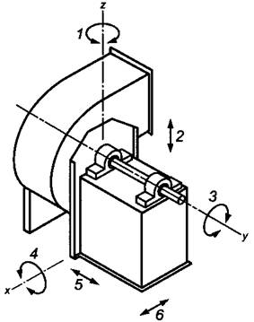1 - гибкая вставка для испытаний; 2 - упруго закрепленный бордюр; 3 - упругая опора; 4 - вспомогательный вентилятор Примечание - На данном рисунке (см. [1], рисунок В.2) изображена установка для испытаний крышного вытяжного вентилятора. Вентилятор установлен на бордюре, имеющем упругую опору. Масса бордюра и собственная частота установленного вентилятора должны удовлетворять требованиям 5.2. Рисунок соответствует рисунку В.2 [1] с добавлением упругой опоры и гибкой вставки между вентилятором и дефлектором. Рисунок 2 - Пример установки крышного вытяжного вентилятора 5.2 Установка вентилятора на упругое основаниеСобственная частота колебаний вентилятора на опорах в направлениях каждой из шести степеней свободы (см. рисунок 3) не должна превышать 0,25 наименьшей рабочей частоты вращения вентилятора в процессе испытаний. Примечание - Руководство по определению собственных частот приведено в приложении А. 1 - колебания вокруг вертикальной оси z, 2 - движение под действием вертикальных сил; 3 - крутильные колебания вокруг оси у; 4 - колебания вокруг оси х; 5 - движение под действием продольных сил; 6 - движение под действием поперечных сил Рисунок 3 - Степени свободы колебаний вентилятора Масса всех элементов, присоединяемых к испытуемому вентилятору, не должна превышать 10 % его номинальной массы, чтобы не вносить существенных изменений в производимую вибрацию. Примечание - Если вентилятор в соответствии со своей конструкцией не предназначен для установки на упругие опоры, то чтобы установить его на такие опоры, могут быть использованы специальные переходные приспособления. Ни один из основных резонансов изгибных колебаний опоры не должен совпадать ни с частотой вращения ротора вентилятора при испытаниях, ни с собственными частотами колебаний опорной системы (когда опору рассматривают как жесткое тело), за исключением случаев, когда проводят исследования совместного поведения вентилятора и опоры. Примечание - При установке вентилятора на упругие опоры реактивный вращающий момент вентилятора может быть значительным (см. рекомендации А.3.2 приложения А в отношении инерционности основания). 5.3 Вывешивание вентилятора на упругих жгутахЕсли вентилятор с двигателем составляют единый узел, поставляемый без опорной рамы, то вентилятор испытывают, вывешивая его на упругих жгутах (примеры показаны на рисунке 4). Примечание - Крепление к опоре с низкой частотой собственных колебаний позволяет получить сопоставимые результаты только для условий свободного воздушного пространства. 1 - вертлюг