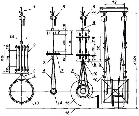стержень (диаметр Примечание - Данную установку применяют для вентиляторов с частотой вращения более 10 Гц (600 об/мин) Рисунок 4 - Примеры вывешивания вентилятора на эластичных жгутах Если для получения вибрационной характеристики в заданной точке нагружения требуется подсоединение к воздуховоду, это соединение выполняют гибким с применением, при необходимости, упругих ограничителей движения в горизонтальном направлении. Вентилятор поддерживается нейлоновыми стропами, соединенными с необходимым числом резиновых жгутов требуемой длины и диаметра, которые симметрично располагают относительно центра
