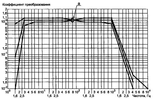 Рисунок 5 - График зависимости номинального значения и допусков на значение коэффициента преобразования от частоты 6.3.2 Измерение среднеквадратичного значения ускорения Частотная характеристика средства измерений, предназначенного для измерения среднеквадратичного значения ускорения, должна быть такой же, что указана в 6.3.1, с допусками по рисунку 5. Примечание - Для сигналов со значением пик-фактора менее трех погрешность измерения среднеквадратичного значения ускорения должна составить менее 5 % или 0,5 дБ. 6.4 Датчики вибрацииС целью обеспечить линейность частотной характеристики во всем диапазоне частот измерений и