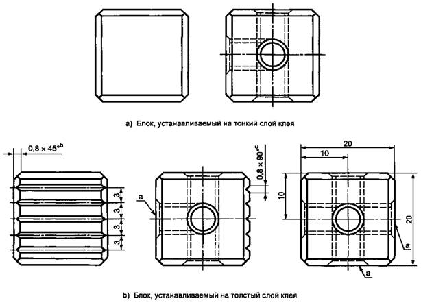 а Высверлить и нарезать резьбу для установки датчика вибрации. b Для всех кромок. с Пять пазов. Примечания 1 Датчик скорости устанавливают на блок больших размеров. 2 При креплении блока к поверхности вентилятора с помощью клеящего состава следует обращать внимание на то, чтобы толщина слоя клея, по возможности, была минимальна, а направления осей измерения не отклонялись от вертикального (горизонтального) направления более чем на 2°. Измерения проводят после того, как клей схватится. В качестве клеящего состава обычно используют: - эпоксидную смолу; - кузовную шпатлевку; - цианоакрилатный клей; - диметакрилатэтилуретандиол; - воск. Рисунок 6 - Типичный блок для установки датчика вибрации 8 Выбор точек измерений8.1 Общие положенияДатчики вибрации устанавливают в точках, которые удовлетворяют следующим требованиям: a) позволяют получить достоверную информацию о вибрационных характеристиках вентилятора с учетом его опоры; b) позволяют характеризовать: - вибрацию, передаваемую в присоединенные конструкции (всасывающий и нагнетательный воздуховоды); - вибрацию, передаваемую на опорную конструкцию (лапы вентилятора); - состояние вентилятора (см. ГОСТ 31350 и приложение С), т.е. на подшипниковых опорах вентилятора и двигателя; с) доступны после установки вентилятора. Следует избегать измерений в точках, где жесткость конструкции невысока. Точки измерений должны быть выбраны таким образом, чтобы в них можно было провести измерения всех трех составляющих поступательной вибрации: в продольном (осевом), поперечном (горизонтальном) и вертикальном направлениях. Примечания 1 Поверхность в выбранных точках измерений может быть специально обработана, чтобы обеспечить: a) непосредственную установку датчиков для измерения вибрации в трех основных направлениях; b) крепление металлического блока, на который устанавливают три датчика вибрации. 2 Рекомендуемые точки измерений для оценки вибрации, передаваемой на присоединенные конструкции, показаны на рисунках 7 и 8.