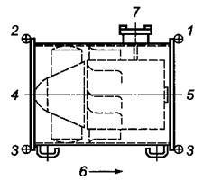 1 - фланец со стороны двигателя; 2- фланец со стороны крыльчатки; 3 - поддерживающий кронштейн (при наличии); 4 - всасывающее отверстие; 5 - нагнетательное отверстие; 6 - направление воздушного потока; 7- кабельный ввод Рисунок 7 - Рекомендуемые точки измерений для осевого вентилятора