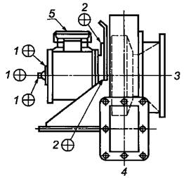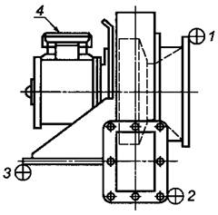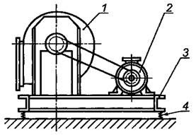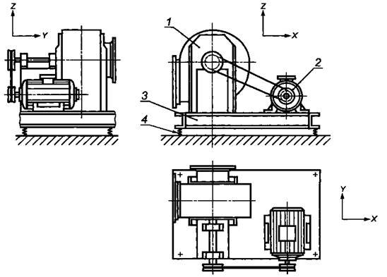 1 - фланец всасывающего отверстия; 2 - фланец нагнетательного отверстия; 3 - поддерживающий кронштейн; 4 - кабельный ввод Рисунок 8 - Рекомендуемые точки измерений для радиального вентилятора 8.2 Установка на несущей рамеЕсли ротор вентилятора не является продолжением вала двигателя, а приводится во вращение через ременную или цепную передачу, и при этом двигатель и вентилятор должны быть установлены на единой несущей раме, то измерение вибрации следует выполнять также в непосредственной близости от упругих опор, на которые установлена эта рама (см. рисунок 9).