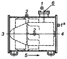 1 - двигатель (со стороны свободного конца вала); 2- опоры двигателя со стороны вентилятора; 3 - всасывающее отверстие; 4 - нагнетательное отверстие; 5 - направление потока воздуха; 6- кабельный ввод