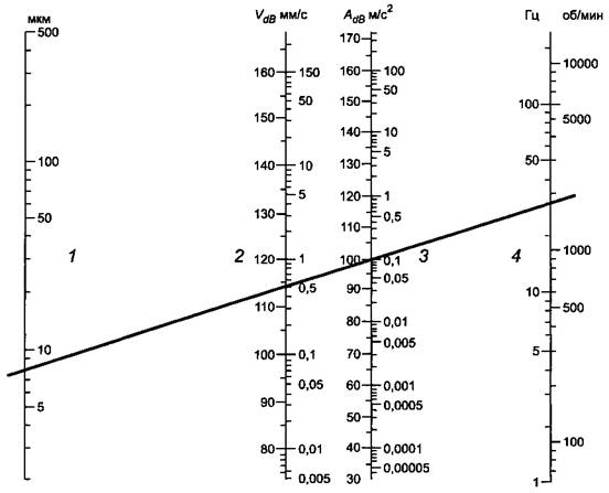 Пример - Пусть для скорости вращения вентилятора 1780 об/мин (30 Гц) размах перемещения составляет 7,62 мкм. Прямая, проведенная через эти две точки, позволяет получить на соответствующих шкалах: