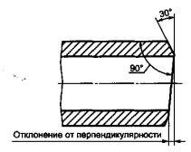 Рисунок 1 - Отклонение от перпендикулярности торца (косина реза) 7.6.4.2 Торцы труб толщиной стенок не менее 3,2 мм должны иметь фаску под сварку. Угол скоса фаски, измеряемый от линии, перпендикулярной к оси трубы, должен быть 30° с допуском + 5°. Ширина торцевого притупления должна быть 1,6 мм с допуском ±0,8 мм. ПС Другая подготовка концов может быть согласована, например, на основании ИСО 6761. Если выполняют внутренний конус расточкой или шлифованием, угол внутреннего конуса, измеряемый от продольной оси, не должен превышать: - для бесшовных труб - как указано в таблице 12; - 7° - для сварных труб наружным диаметром не менее 114,3 мм. Таблица 12 - Максимальный угол внутреннего скоса для бесшовных труб