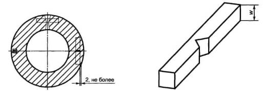 где Т - толщина стенки, мм. При малых толщинах стенки образцы должны изготовляться путем механической обработки (рисунок 5b). Если нельзя получить наименьший из необходимых поперечных образцов, то следует использовать продольный образец максимально возможной ширины от 5 до 10 мм.