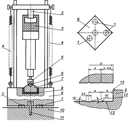 1 - диски из синтетической резины или из материала с аналогичными свойствами с твердостью по Шору А от 70 до 80, толщиной 10 мм и диаметром 75 мм; 2 - облицованная полиамидом скоба, пригнанная к рукоятке машины; 3 - машина; 4 - механический пружинный или пневматический механизм, создающий осевое усилие; 5 - пуансон; 6 - шар из закаленной стали диаметром 38 мм; 7 - промежуточная плита из закаленной стали массой М2 и диаметром D, имеющая с нижней стороны пазы; 8 - диск из синтетической резины или материала с аналогичными свойствами с твердостью по Шору А от 70 до 80, толщиной от 6 до 7 мм, плотно пригнанный к стенкам; 9 - стальное основание массой с цилиндрической выемкой, диаметр которой на 1 мм больше диаметра промежуточной плиты, а дно выемки снабжено пазами; 10- бетонный блок, установленный на устойчивой поверхности; 11 - стальной стержень, препятствующий горизонтальному смещению; 12 - шлифованные поверхности и кромки