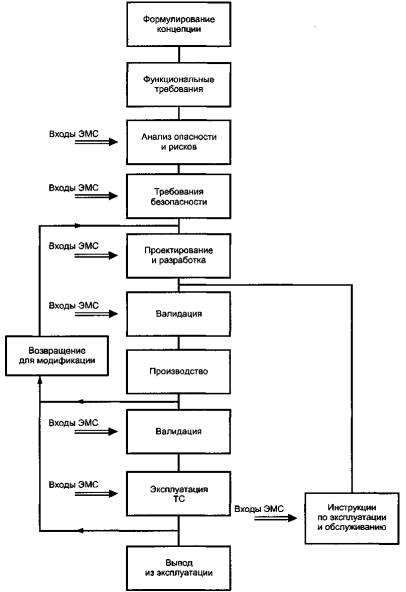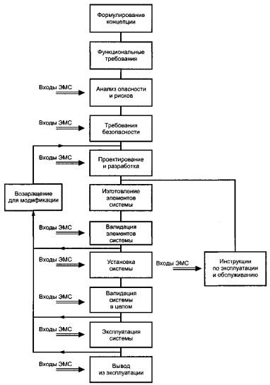 Рисунок 2 - Схема обеспечения функциональной безопасности применительно к стадиям жизненного цикла системы 6 Электромагнитная обстановкаОбзор классов и видов электромагнитных помех, которые, как правило, необходимо принимать во внимание при обеспечении функциональной безопасности ТС, приведен в таблице 1. Общая информация о видах и уровнях электромагнитных помех применительно к различным условиям электромагнитной обстановки содержится в ГОСТ Р 51317.2.4, ГОСТ Р 51317.2.5, ГОСТ Р 51317.4.1, ГОСТ Р 51317.6.5. Сведения об уровнях электромагнитных помех, которые, как предполагается, обычно не превышаются в нормальных условиях электромагнитной обстановки, приведены в приложении А, таблица А.1. Некоторые из видов электромагнитных помех с достаточно малой вероятностью возникновения, не учитываемых в стандартах МЭК, распространяющихся на ТС, необходимо в определенных случаях принимать во внимание. Примерами могут служить кондуктивные и излучаемые электромагнитные помехи в полосе частот от 3 до 150 кГц. Уровни электромагнитных помех, установленные в различных стандартах, должны тщательно анализироваться с учетом их влияния на функциональную безопасность ТС. В частности, необходимо учитывать следующее: а) уровни электромагнитных помех изменяются в соответствии со статистическим распределением. Поэтому значения, приведенные в приложении А, таблица А.1, могут быть в некоторых случаях значительно превышены. Однако такие случаи могут возникать нечасто или в определенных местах размещения ТС (см. [13]); б) установленные в стандартах степени жесткости испытаний и критерии качества функционирования ТС при испытаниях на помехоустойчивость относятся, как правило, к обеспечению функционирования в условиях электромагнитных помех, но не к функциональной безопасности. Необходимо также учитывать необходимость установления соответствующего запаса помехоустойчивости для обеспечения функциональной безопасности; в) характеристики устойчивости ТС к электромагнитным помехам могут ухудшаться со временем; г) для предотвращения возникновения опасных ситуаций может быть необходимо ограничить в определенной обстановке использование конкретных видов оборудования (например мобильных телефонов). Примечание - В качестве уровня электромагнитной помехи, который необходимо принимать во внимание при обеспечении ЭМС, часто применяют уровень электромагнитной совместимости (см. 3.4), устанавливаемый так, чтобы он мог быть превышен лишь с малой вероятностью. Как правило, полагают, что уровень электромагнитной помехи не должен превышать уровень электромагнитной совместимости в 95 % случаев возникновения помехи превышение уровня ЭМС возможно лишь в 5% случаев. Учитывая это, значения, приведенные в качестве типичных уровней электромагнитных помех в таблице А.1, представляют собой не уровни электромагнитной совместимости, а значения, близкие к уровням испытаний на устойчивость к электромагнитным помехам, установленным в ГОСТ Р 50648, ГОСТ Р 50649, ГОСТ Р 50652, ГОСТ Р 51317.4.2 - ГОСТ Р 51317.4.6, ГОСТ Р 51317.4.11 – ГОСТ Р 51317.4.14, ГОСТ Р 51317.4.16, ГОСТ Р 51317.4.17, ГОСТ Р 51317.4.28, разработанных на основе стандартов МЭК серии 61000-4. В некоторых случаях, например для систем или установок, может потребоваться установить пониженные уровни электромагнитной эмиссии от различных ТС - источников помех или за