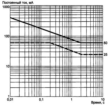 Рисунок 1 - Максимальный ток после единичной неисправности 6.1.3 Предельные значения при наличии одного заземляющего проводникаЕсли один из проводников УПТ-Т цепи» нормально подключенный к телекоммуникационной сети, случайно оказывается заземленным, то: - ток между другим проводником и землей, измеренный через резистор 2000 Ом ±2% при любой внешней нагрузке, не должен превышать соответствующего предельного значения, указанного на рисунке 1 для цепи «фаза-земля» с учетом предельного значения 25 мА через 10 с после соединения проводника с землей и - напряжение разомкнутой цепи между другим проводником и землей не должно превышать максимального напряжения для УПТ-Т цепи, определенного в соответствии с перечислениями с), d) 6.1.1. Измерение проводят через 2 с после соединения проводника с землей. Соответствие требованию проверяют осмотром и измерением. 6.2 Предельные значения в УПТ-Н цепях6.2.1 Предельные значения при нормальных условиях эксплуатацииПри нормальных условиях эксплуатации УПТ-Н цепь должна соответствовать следующим требованиям: - значение установившегося напряжения разомкнутой цепи между землей и каждым проводником, который обычно соединен с телекоммуникационной цепью, не должно превышать: - 140 В постоянного тока; - 200 В постоянного тока при условии, что устройство контроля и наблюдения используется для ограничения значения тока на землю в соответствии с 6.2.3; - максимальная энергия (мощность), подаваемая на любую нагрузку, соединенную с телекоммуникационной сетью, не должна превышать 100 Вт через 1 с; - значение тока в установившемся состоянии, которое может быть подано в телекоммуникационную сеть, должно соответствовать указанному в МЭК 60950-1 (пункт 6.3); - номинальное напряжение изоляции УПТ-Н цепи, получающей питание через телекоммуникационную сеть, должно соответствовать постоянному напряжению 400 В между проводниками и 200 В - между любым проводником и землей. Примечание - Номинальное значение напряжения также применяют к соединителям. Соответствие требованию проверяют осмотром и измерением. 6.2.2 Предельные значения при условиях единичной неисправностиПри единичной неисправности [см. МЭК 60950-1 (пункт 1.4.14)] в питающем оборудовании УПТ-Н цепи, если любой ее проводник, подсоединенный к телекоммуникационной сети, может оказаться заземленным, то: - в течение первых 200 мс выходное напряжение между каждым проводником и землей или непосредственно между проводниками, измеренное на резисторе 5000 Ом ±2% (при этом все цепи нагрузки отсоединяют), не должно превышать предельных значений, приведенных в МЭК 60950-1 (рисунок 2D); - после первых 200 мс должны применяться предельные значения по 6.2.1. Соответствие требованию проверяют осмотром и измерением при имитации неисправностей, которые могут произойти в оборудовании, Примерами могут служить неисправности компонентов, нарушение изоляции, 6.2.3 Предельные значения при одном заземленном проводникеЕсли один из проводников УПТ-Н цепи, подсоединенный к телекоммуникационной сета, может оказаться заземленным, то: - напряжение разомкнутой цепи между другим проводником и землей не должно превышать максимально подаваемого на УПТ-Н цепь напряжения после 200 мс; - для УПТ-Н цепи, у которой постоянное напряжение разомкнутой цепи превышает 140 В при нормальных условиях эксплуатации, значение тока между другим